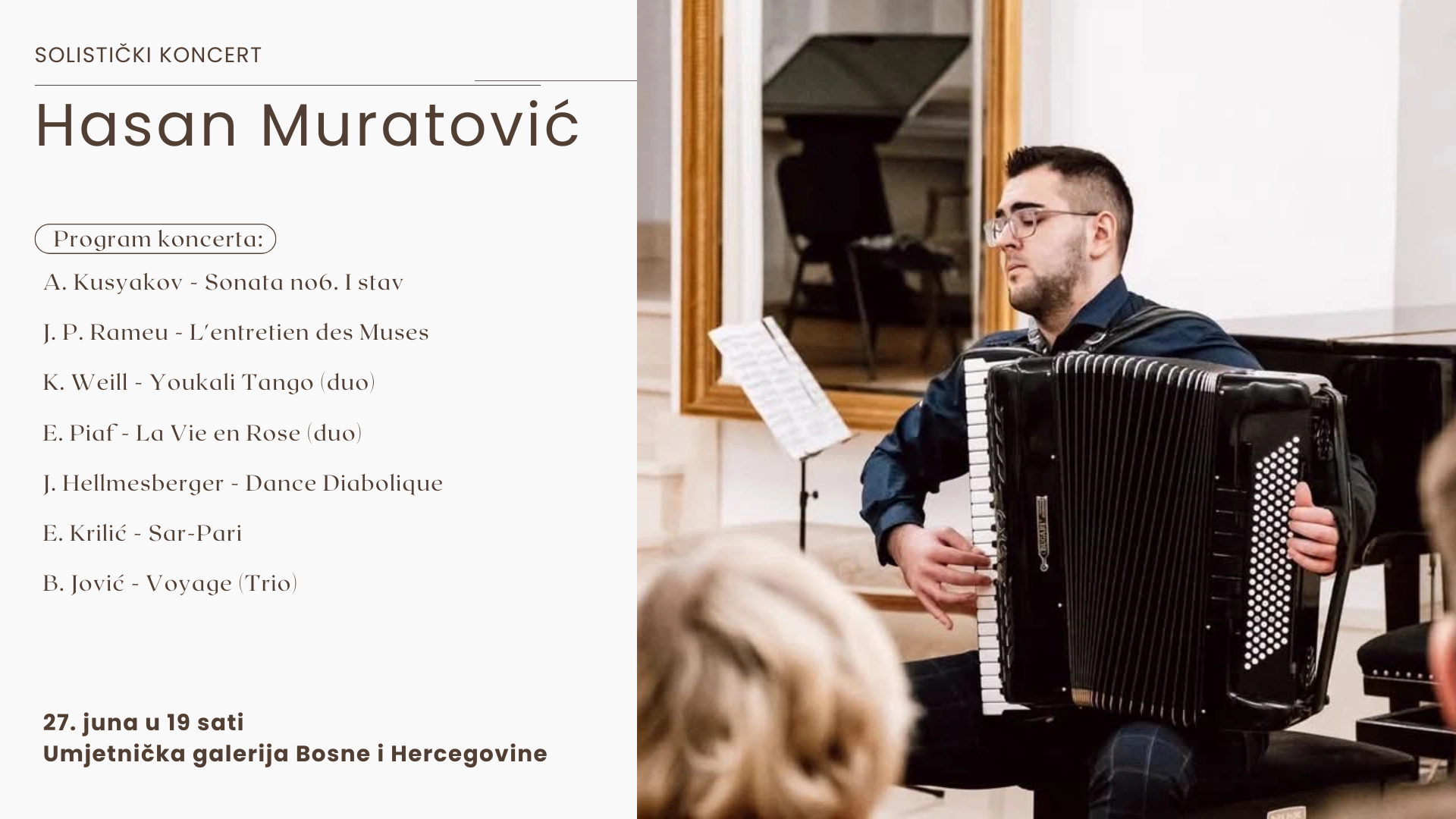 Umjetnička galerija Bosne i Hercegovine s ponosom vas poziva na koncert Hasana Muratovića, mladog i izuzetnog harmonikaša koji iza sebe već ima impresivnu muzičku karijeru.